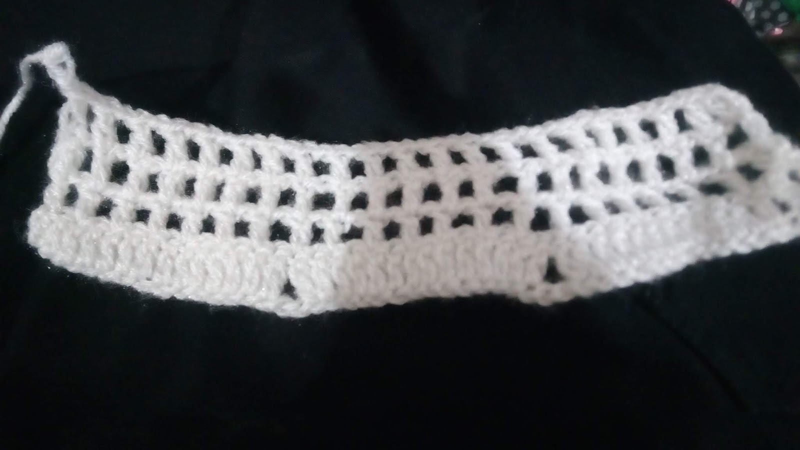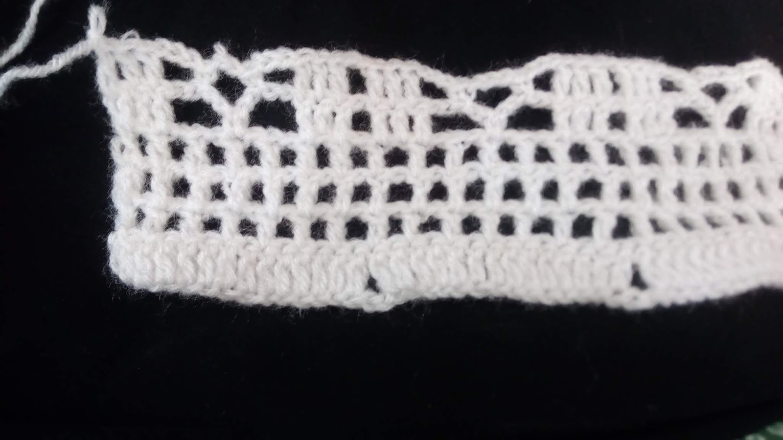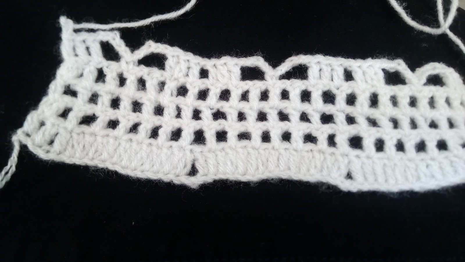 3rd row:- शुरू में एक लॉन्ग बनाएँगे, फिर एक चेन लेंगे और एक लॉन्ग छोड़कर दूसरे में एक लॉन्ग बनाएँगे | ऐसा ही पुरे row में बनाएँगे | total 22 box बनने चाहिए |