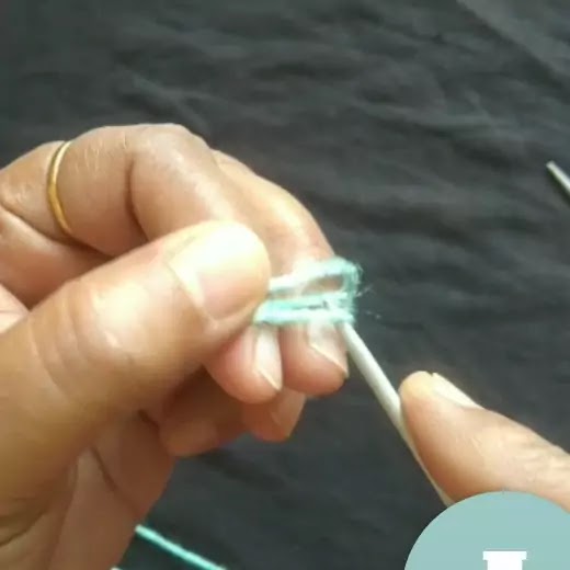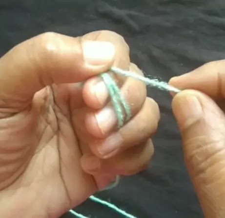1- ऊन (Yarn) को दो उंगलियों के चारों ओर घुमाएंगे और दुबारा yarn को घुमाएंगे (इसे पहले वाले yarn के पीछे से घुमाना है।